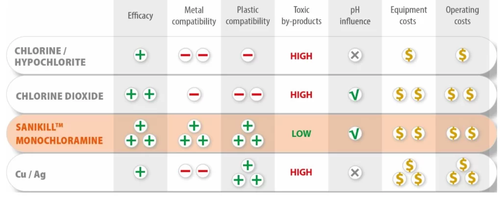 ChemTreat has partnered with Sanipur to offer SANIKILL®, a monochloramine-based supplemental disinfection technology for potable water systems. This patented technology offers many benefits over chlorine-based oxidizers and other industry-standard disinfection technologies.