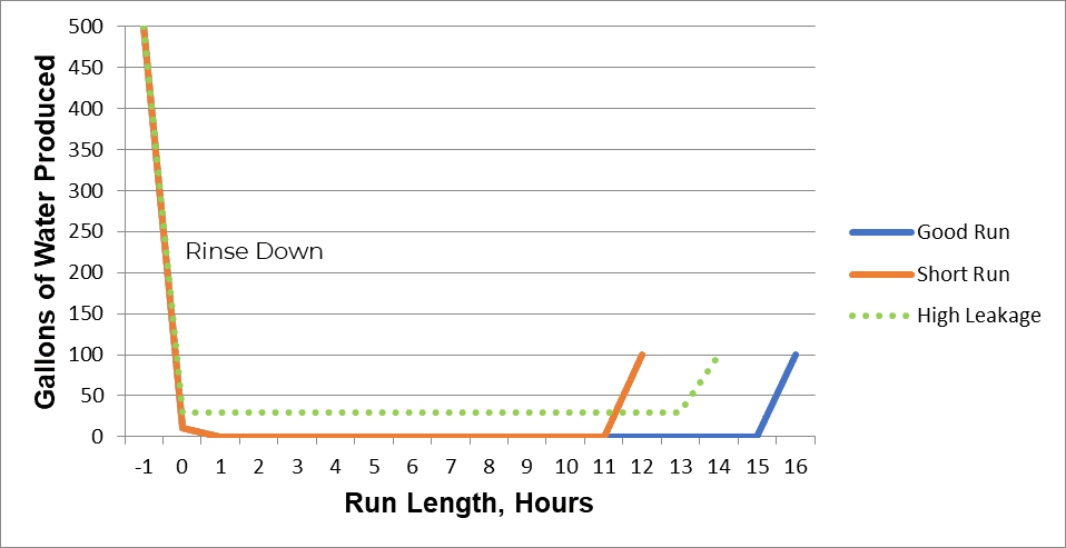 A short run indicates low throughput. The quality of the produced water can be acceptable, but conductivity and/or silica breakthrough occurs early, and the system produces fewer gallons of process water between regenerations.