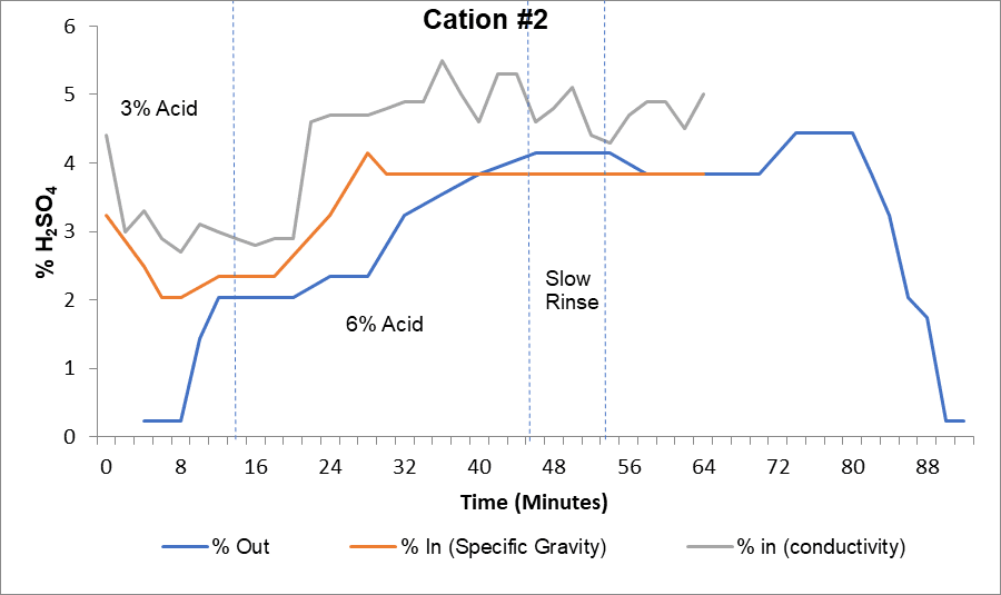 This regeneration required a 3% acid step and a 6% acid step. The high-range conductivity probe showed target acid concentrations were being reached, but manual hydrometer sampling indicated that acid was underfed by at least 1% in each step. After calibrating the conductivity meter, the plant achieved proper operational levels.