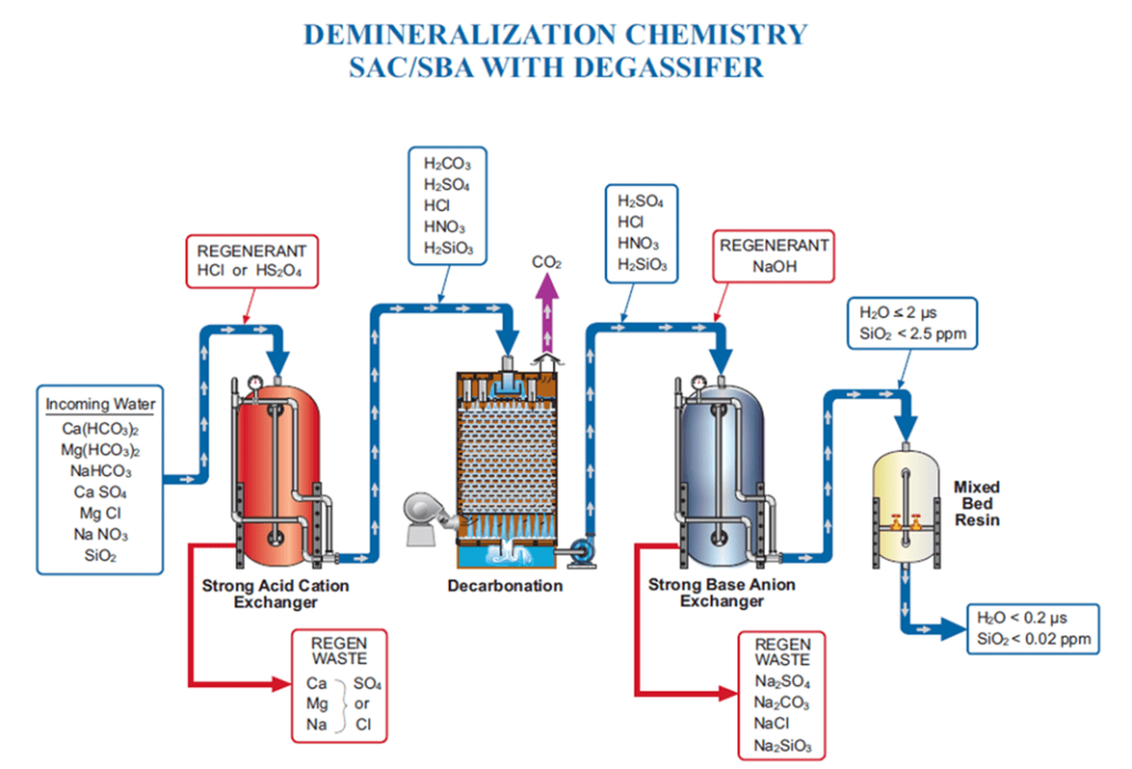 The water then passes through a degassifier to strip carbon dioxide (CO2) from the water and expel it to help reduce anionic loading to the anion unit.