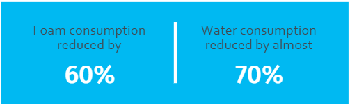 FillerScrub™ reduced off-line cleaning time from 1 hour to 20 minutes per day. Personnel required for the cleanings decreased from 4–5 down to just 2.  Foam consumption was reduced by 60%, and water consumption was reduced by almost 70%. The reduction in off-line cleanings increased production time by 10,000 minutes per year, allowing for more effective use of line personnel to produce additional product.
