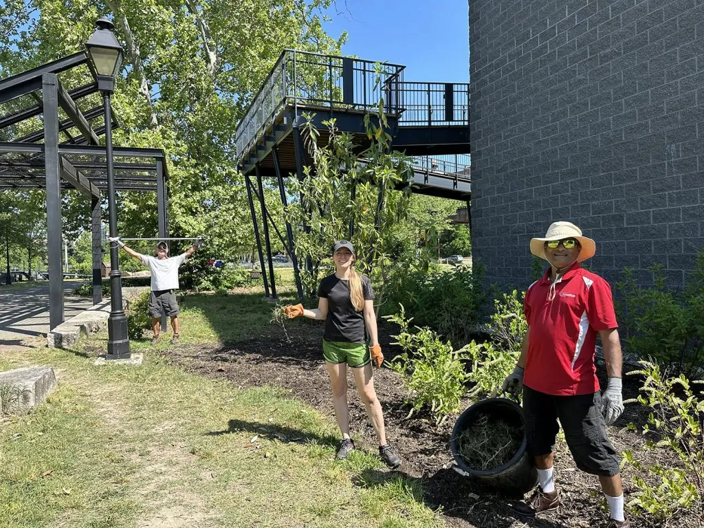 ChemTreat volunteers remove invasive plants outside the new JRA education center. Left to right: Curt Turner, Senior Research Chemist; Jayne Deal, Global Environmental Manager; and Naresh Mahamuni, Associate Scientist.