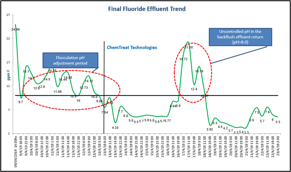 P8200L and P835EB were subsequently tested in a field trial. The following graph shows fluoride ppm before and after the ChemTreat product application. Before ChemTreat technology was applied, results were out of limit (>10 ppm). After applying ChemTreat technology, fluoride was reduced to <10 ppm.