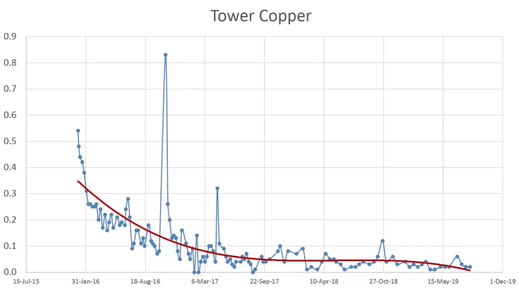 Tower iron and copper levels have declined steadily since ChemTreat took over at this facility in late 2015, indicating the plant's critical assets are being protected.