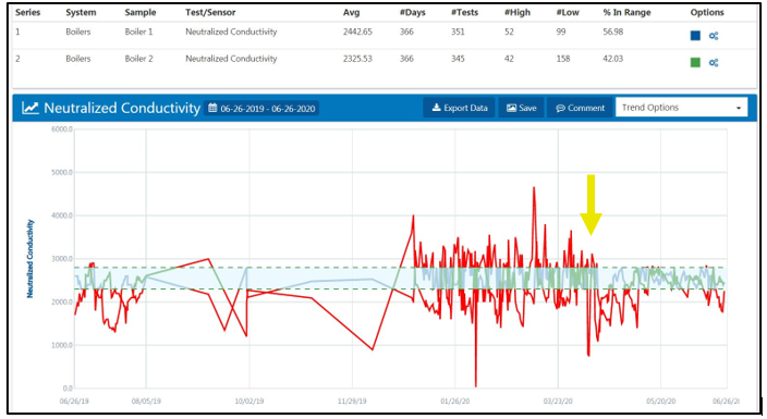 Neutralized conductivity trend chart generated by CTVista+ to monitor performance. The green spectrum indicates the range of desired conductivity. The yellow arrow indicates when the new controller was installed.