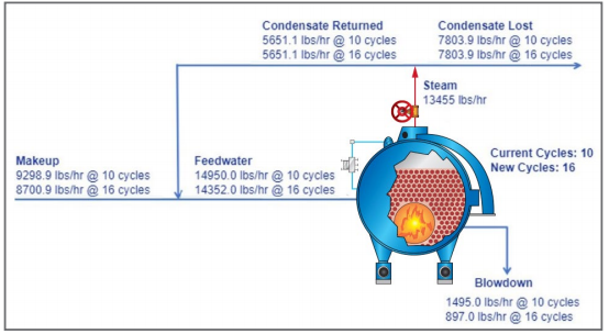 This firetube boiler mass balance diagram, generated within CTVista+, shows the water savings associated with increasing cycles of concentration from 10 to 16.