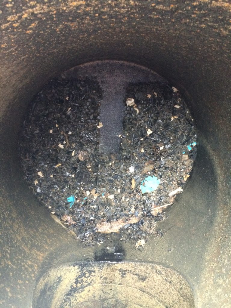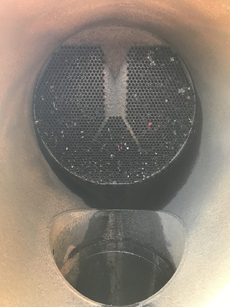 Picture of the inlet section of the surface condenser. Poor vacuum directly impacts the plant’s productivity. This was taken before ChemTreat FlexPro treatment was applied. There is trash from the tower fill on the tube sheet and scale and corrosion byproducts laid down on the inlet piping and plenum.