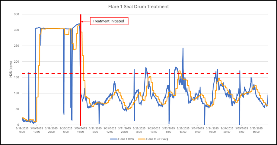 When the second flare system was brought back on-line, operators again struggled to meet permit limits. CT9156 was applied to this seal drum as well, and H2S levels were reduced to well below the three-hour 162 ppm limit.