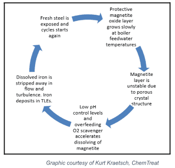 Controlling ammonia/amine and oxygen scavenger comes into play at the next stage, as lower pH and high oxygen scavenger levels accelerate the dissolution of the magnetite layer.