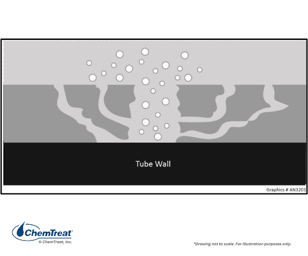 The following graphic demonstrates a principle called wick boiling, where porous iron deposits form on a boiler tube’s higher heat flux areas. These deposits occur when water with ionic impurities flows into the tube and evaporates off, creating high levels of concentration of these acidic and caustic species. This results in underdeposit corrosion in the form of tube wastage. Wick boiling typically causes hydrogen damage at a pH of 4, acid phosphate at low pH, and caustic gouging at high pH.
