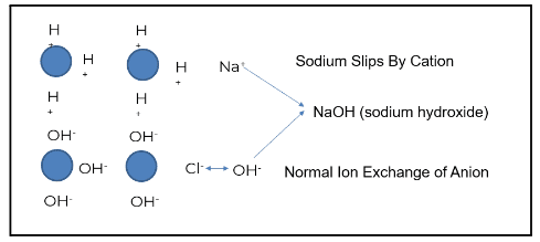 Sodium is a prevalent ion seen when the cation bed starts to slip. In the example above, sodium does not exchange with the hydronium or hydrogen ion; this is known as “slipping.” The slip causes the sodium to go through the chloride. Sodium chloride then exchanges out with a hydroxyl ion, and sodium slips as sodium hydroxide.