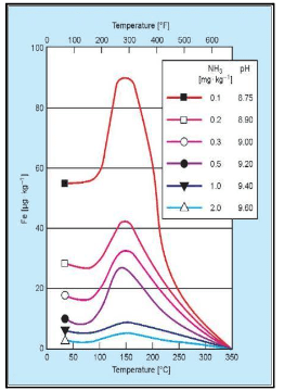The individual-colored lines represent pH. As pH increases, the system’s ability to resist the dissolution of the magnetite layer increases. The highest solubility shown on this graph is a pH 8.75, dropping off significantly as pH increases to the 9.4–9.6 range. Thus, balancing feedwater and condensate operation at the highest practical pH, while effectively treating yellow metals, can be very difficult.