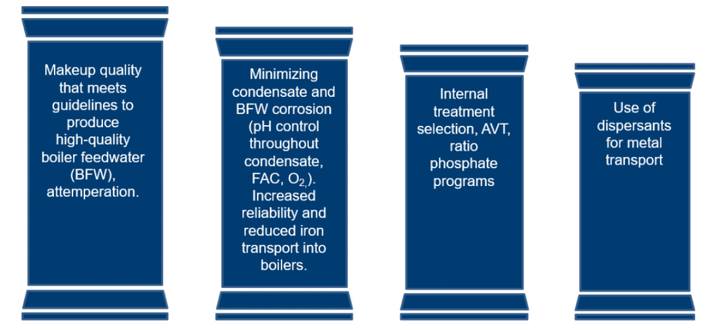The third pillar addresses the importance of selecting the right steam gyrator and boiler internal treatment based on a system’s specific needs. This could include all-volatile treatment (AVT) ratio programs using sodium phosphate or all-polymer programs that can be used at lower pressures.