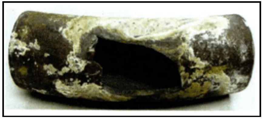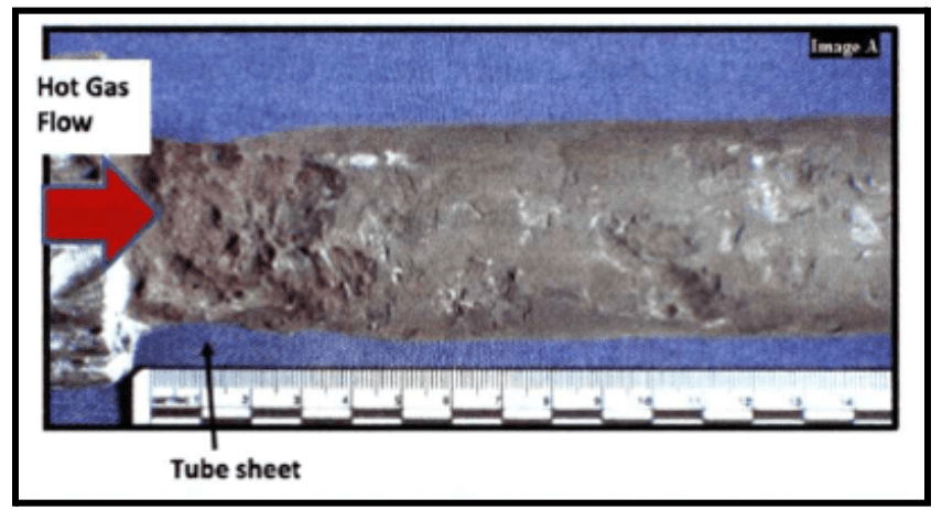 The following images show examples of underdeposit corrosion. The first is a transfer line exchanger (TLE) from a methanol plant, where waste heat gas was sent through the tubes. Acid phosphate wastage caused the formation of underdeposit corrosion sites. The plant had switched to a much higher-level sodium phosphate program years before, but the damage was already done.