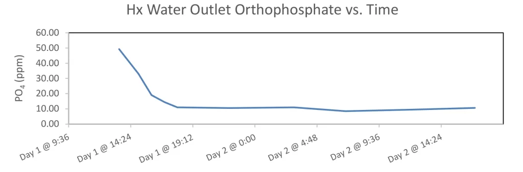 Phosphate residual was five times the background levels for the first 24 hours of the cleaning and then tapered off before the increase in pH from 2.5 to 6.5.