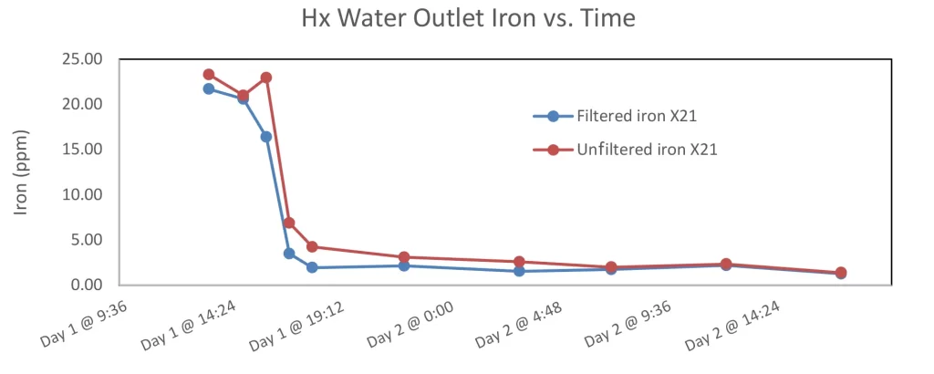 Iron followed the same pattern as phosphate, tapering off before the increase in pH from 2.5 to 6.5. The unfiltered represents the ferric ion, and the filtered represents the ferrous ion. Minimal ferric oxide was recorded during the low pH cleaning, indicating relatively low corrosion on the tube bundle