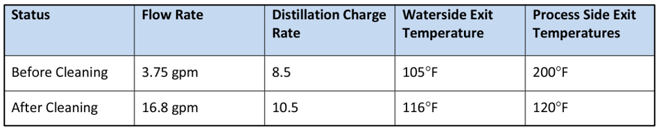 The cleaning product performed well, removing the majority of the scale, including calcium phosphate, in the first 24 hours. This cleaning improved the flow rate over 400 percent and allowed an increase in the charge rate to the distillation column. Exit temperatures on the waterside increased from 105 to 116°F while the process side exit temperature dropped from 200 to 120°F. The program can generally be run for as short as 24 hours or extended as a permanent application in extreme conditions. Typical applications are 3 to 30 days at a tower pH of 6.2 to 7.5.