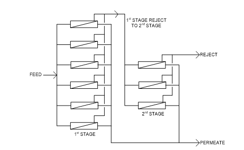 A critical feature of RO is illustrated in this diagram. With “normal” feedwaters, approximately 50% of the influent is converted to permeate in the first stage. This means that without further processing, 50% of the feedwater would be wasted. In the common two-stage design, first-stage reject is routed through additional pressure vessels in the second stage increasing total water recovery to 75%.