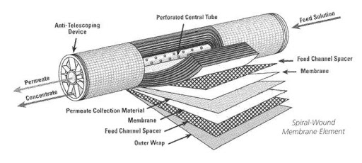 A flat membrane sheet has as a backbone of several layers, which are all wrapped around a central, perforated plastic core. Feedwater enters the front end of each element and flows along the feedwater carrier, while pressure pushes water through the membrane. The purified water, known as permeate, flows to the central core, and the increasingly concentrated feedwater (reject) exits the element.