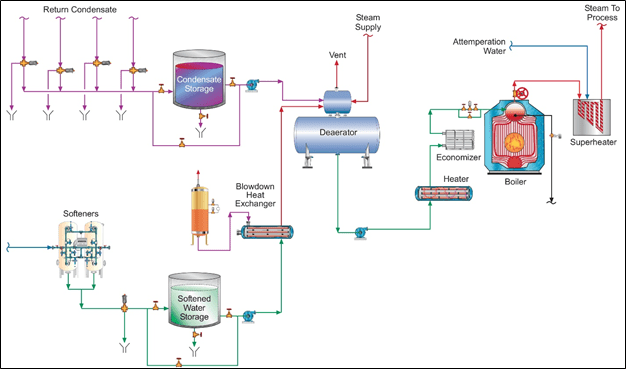 Now, as resource conservation and concerns regarding global climate change continue to grow, so does the development of co-generation and combined heat and power (CHP) facilities. Steam is often utilized for multiple purposes at these plants, including power production, energy for process heat exchangers, power to drive turbines that operate heavy machinery, and in the case of CHP, heat for central business districts in large cities and for hospitals, universities, and other institutions. A general outline of an industrial co-generation network is shown below.