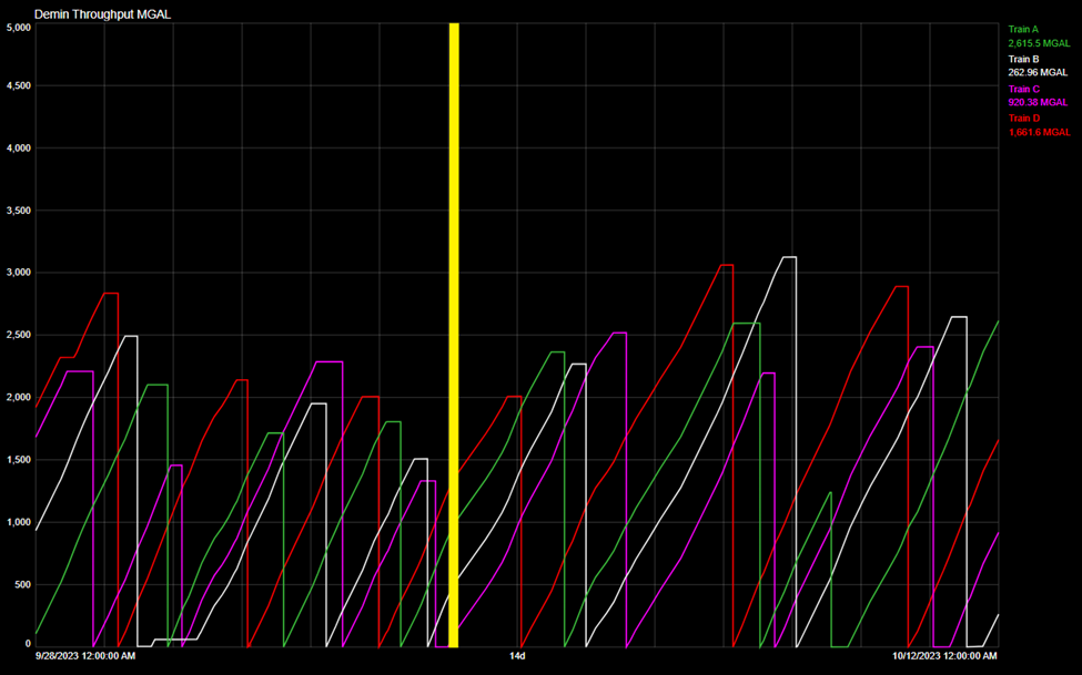Trend chart tracking demineralizer throughputs, which is heavily influenced by RO permeate quality. The yellow line indicates the date of repairs, with throughputs increasing after repairs were completed.