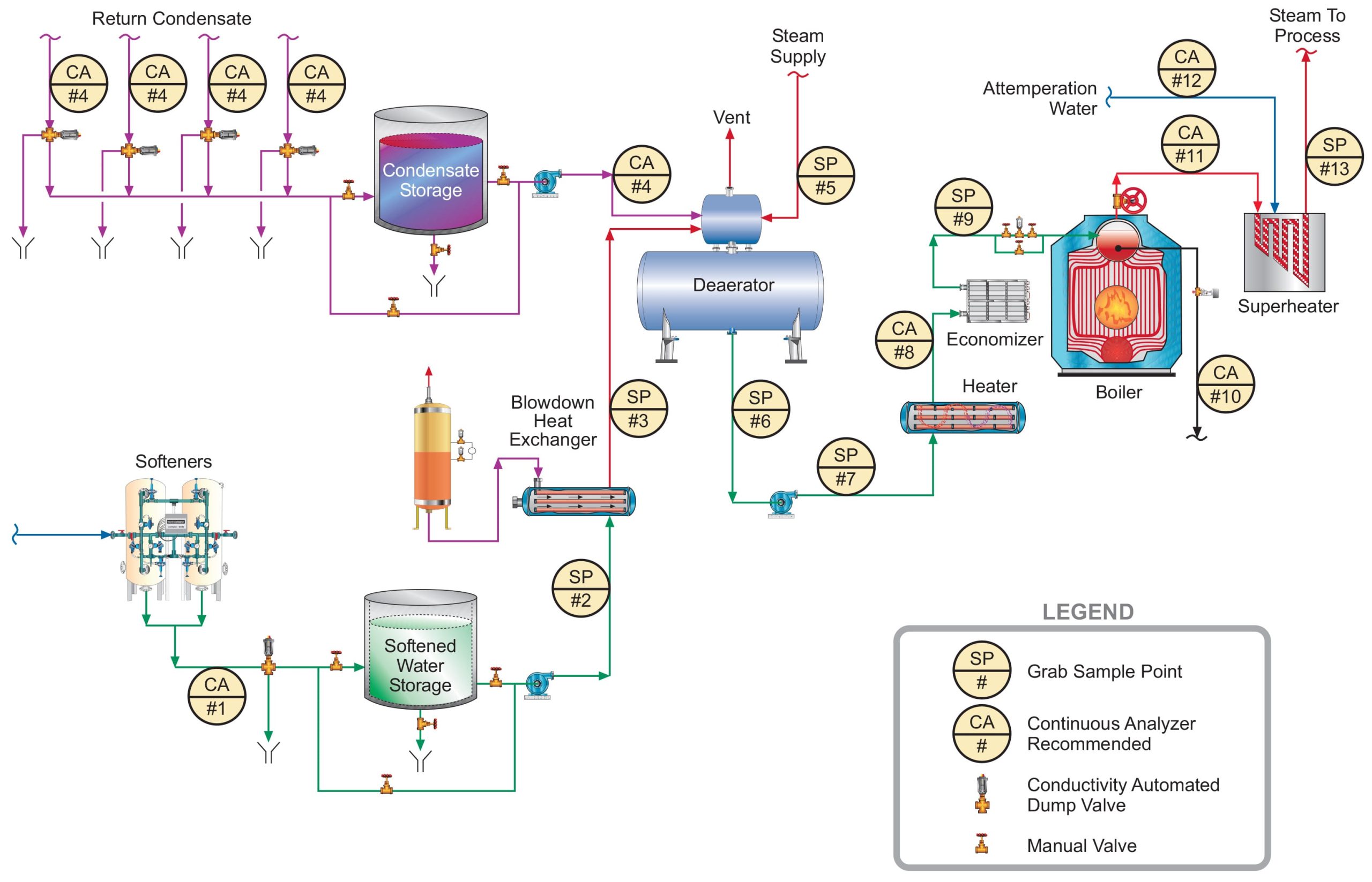 The following text progresses through the numbered sample points, with some commentary about the evolution of chemical treatment advancements that offer improvement over former technologies. An important point to note in the diagram and in the discussion below is that continuous sampling is recommended at several locations. Continuous water/steam chemistry monitoring is, of course, important for high-pressure/temperature power generating units, but even in these lower pressure systems some upsets can cause serious damage in short order which cannot be detected in a timely manner with grab sampling alone.