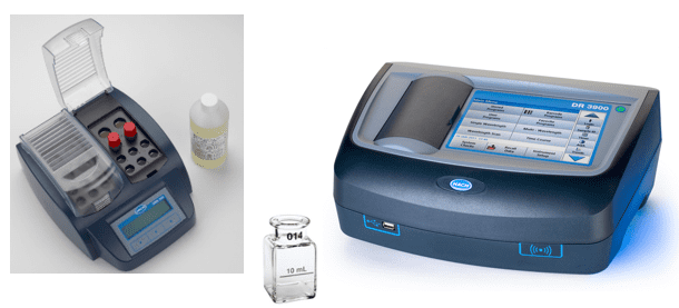 Figure 5. Combination reagent, digestion vials, and heater block (left); 1-inch sample cell (center) and spectrophotometer (right).
