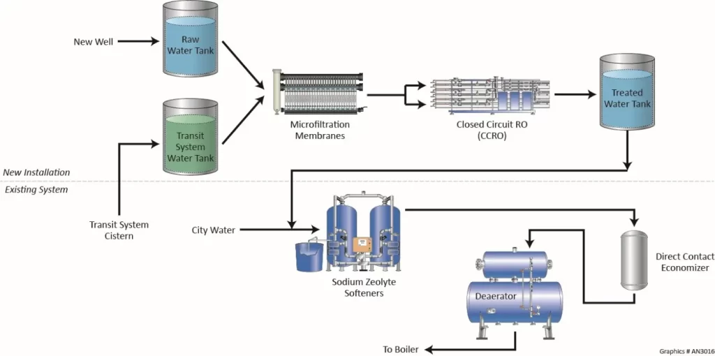 The main issue to be resolved was controlling silica scale potential while producing the maximum amount of water possible. The ground water and city water vary greatly in quality, making treatment a challenge. The ground water has a high concentration of silica (up to 60 ppm), which causes silicate scaling on critical system assets.