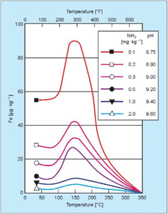 Figure 2. Influence of pH and temperature on iron dissolution from carbon steel.  Source:  Sturla, P., Proc., Fifth National Feedwater Conference, 1973, Prague, Czechoslovakia.