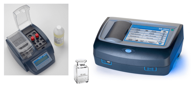 Figure 3. Combination reagent, digestion vials, and heater block (left); 1-inch sample cell (center) and spectrophotometer (right).  Photos courtesy of Hach.