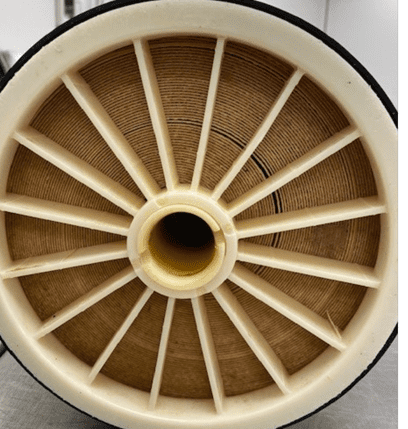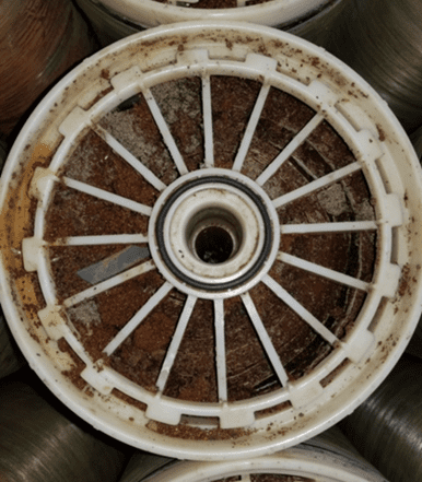 A plant was experiencing consistently high ΔP. In the photo below, there is brown debris built up at the base of the stay rods, around the holes meant for filtered water. Any debris not flushed out of the cartridge filter housing will be pushed into the bottom compartment and the lead element. When this happens, it is very difficult, if not impossible, to remove what is lodged into the face of the lead membrane with RO cleaning chemicals.