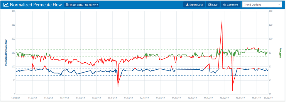 When considering the normalized line, note whether the flow remains within its standard limits. If it does, the RO does not need to be cleaned. Normalized trending also accounts for temperature fluctuations.