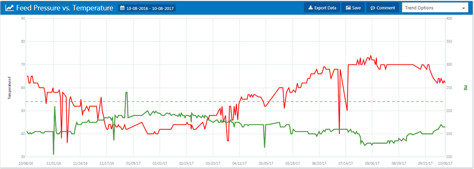 It is important to be proactive when noting a downward trend. In this example, operators should set up the clean-in-place (CIP) and schedule a cleaning. Otherwise, the membranes will eventually need to be replaced.
