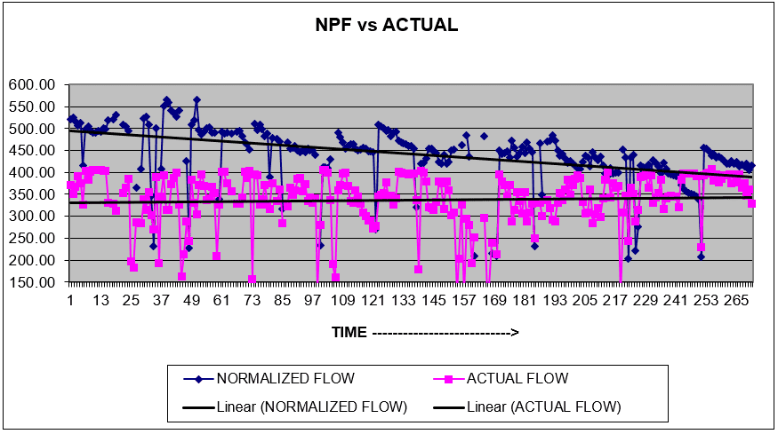 The above shows a very good example of normalized versus permeate flow. The trend lines appear rather busy; however, the dark blueline of the normalized permeate flow is slowly falling and never returns to the baseline. This indicates the operator has waited too long to clean the RO.