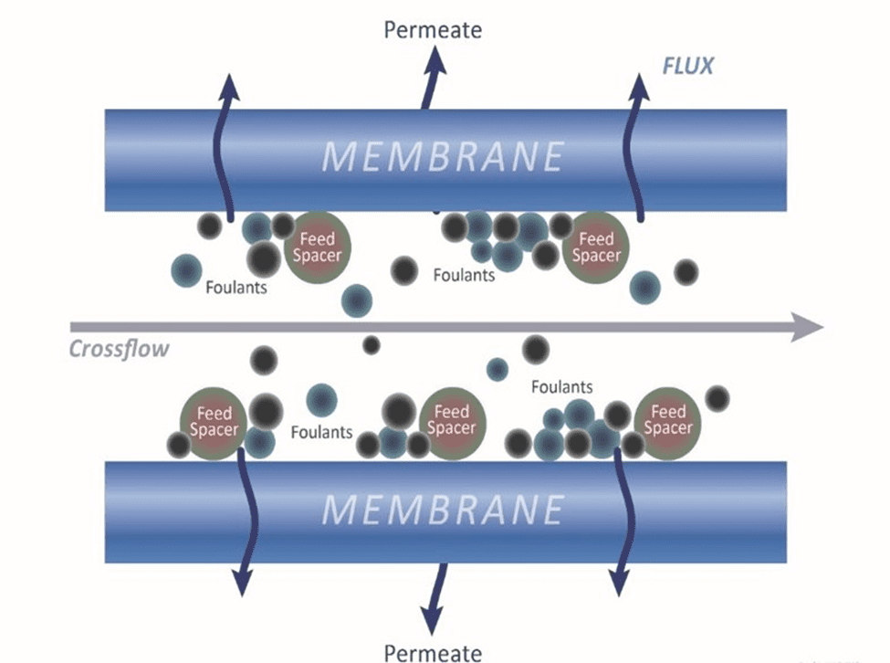 In the schematic below, the blue bar represents the membrane sheet, and the brown circles represent the feed spacer. As feedwater flows through the RO, colloidals and bacteria will become packed in the feed spacers. Bacteria excrete polysaccharides, which will attract and trap colloidals and suspended particles that are difficult to clean out.