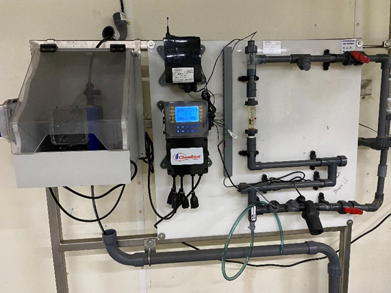 To maintain a constant pH, the site installed a control panel consisting of an Advantage Controls MegaTron controller, flow switch, pH probe, cellular data modem, corrosion coupon rack, and chemical dosing pump.
