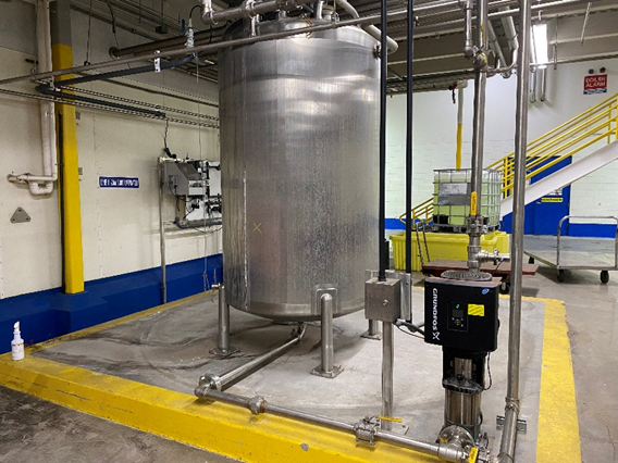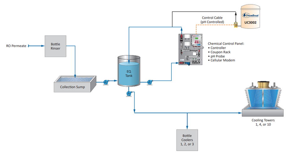 The aseptic production line at this plant uses an antimicrobial agent to sterilize bottles. The bottles are then rinsed with sterile reverse osmosis (RO) water heated up to pasteurizing temperatures and cooled down. This water was being sent to drain at the rinser, resulting in high water costs. The ChemTreat team was asked to come up with a way to reuse this water in other processes instead.